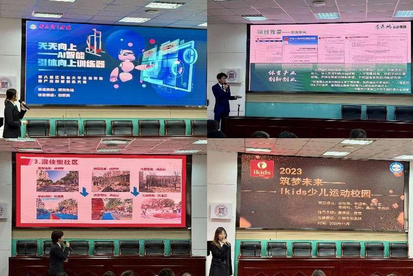 来自江苏省各高校的28个项目参加此次大赛,经过复赛的选拔,14支队伍进入决赛,我院3支参赛团队均进入决赛进行角逐。本届大赛复赛采用项目组汇报和专家组提问答辩的形式,参赛选手从市场需求和发展前景出发,结合自身专业背景,提出创新创业的项目方案并进行汇报。经过激烈的比拼,由叶小瑜、吴圣平老师指导的《“微更新”撬动“大幸福”———城市社区运动空间微改造方案与应用》项目获大赛特等奖;詹虚致、唐佳老师指导的《筑梦未来———ikids少儿运动校园》项目获大赛一等奖;由刘雅巍、孙国友老师指导的《天天向上———AI智能引体向上训练器》项目获大赛二等奖。