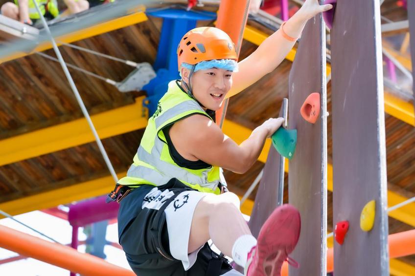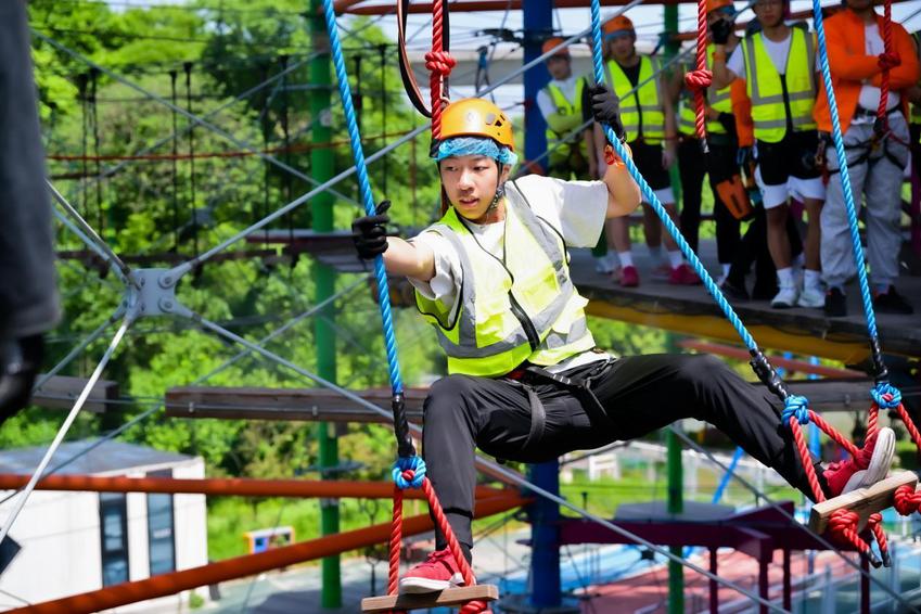 金陵矩阵集户外拓展、绳索攀爬、低空蹦极、高空秋千、疯狂滑道于一体,涵盖139种难度各异的体验元素。同学们在主持人的带领下在2-5层进行不同难度、风格的挑战。挑战过程中,各小组制定不同策略,创新通关玩法,在分工与合作、挑战与鼓励中,既充分发挥了自己的聪明才智和团队的合作精神,又展现出大学生的昂扬风貌与拼搏姿态。