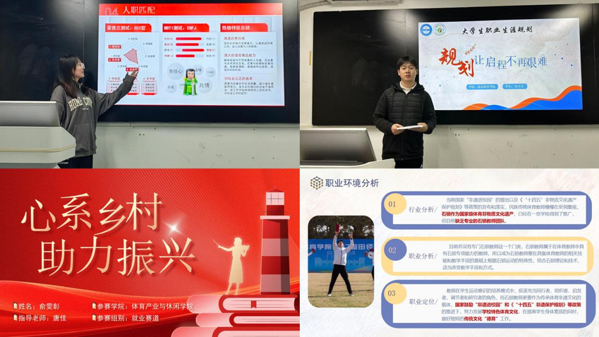 11月24日,为引导大学生树立正确的就业观和择业观,增强体育产业与休闲学院学生的职业生涯规划意识,提高学生的创新能力、实践能力和就业创业能力,学院举办了第九届大学生职业生涯规划大赛学院初赛。大赛分为两个赛道,成长赛道和就业赛道,经过层层选拔和激烈的角逐,推荐朱天昊(成长赛道)、俞雯彰(就业赛道)两位同学晋级校赛。