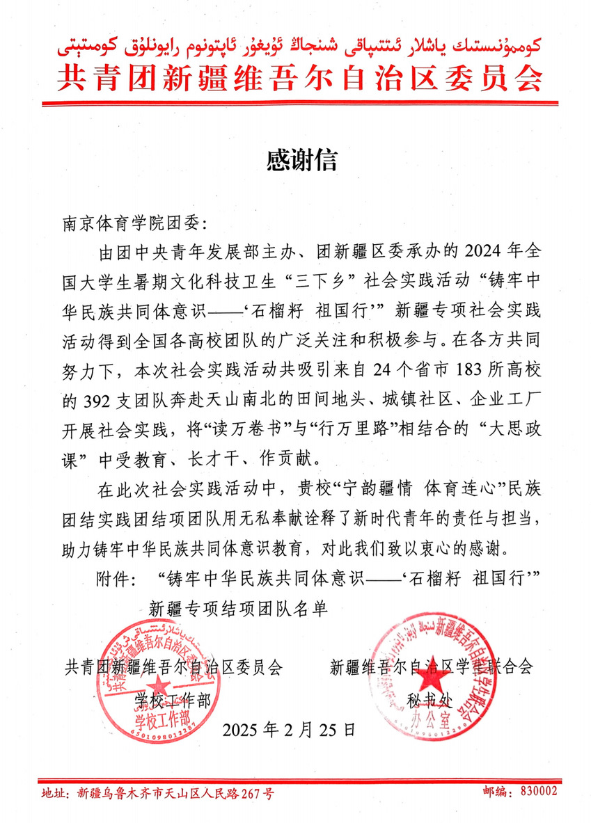 近日,团新疆区委学校工作部、新疆学联向PA视讯团委发来感谢信,对体育产业与休闲学院“宁韵疆情体育连心”民族团结实践团在2024年全国大学生暑期文化科技卫生“三下乡”社会实践活动“铸牢中华民族共同体意识——‘石榴籽 祖国行’”新疆专项社会实践活动中的表现,给予了高度赞扬和诚挚感谢。