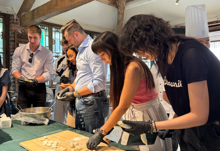 在包饺子环节,食堂大厨现场示范擀皮、填馅、捏褶技巧。学生们积极承担翻译工作,外籍教师们认真学习,来自俄罗斯的Rodian虽手法生疏,却兴致盎然:“这是我第一次亲手制作中国传统美食,形态各异的饺子里都是新奇的体验!”最后,他还捏出了一个具有俄罗斯风格的中国水饺。