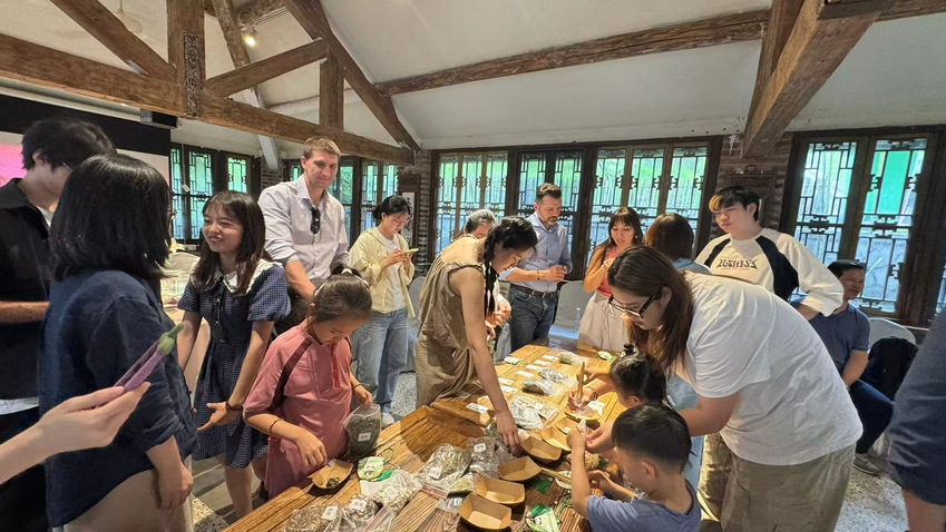 活动伊始,党总支书记王进致辞表示:“端午节承载着中华民族千年的文化记忆,希望通过此次活动,让国际友人近距离感受中国传统节日的魅力,以文化为纽带,搭建起中外友好交流的桥梁。”粽子飘香间,中外师生围坐协作,折粽叶、填糯米、扎丝线,一枚枚饱含情谊的粽子在指尖成型。Richard 的孩子在学生指导下完成人生首个粽子,兴奋之情溢于言表。