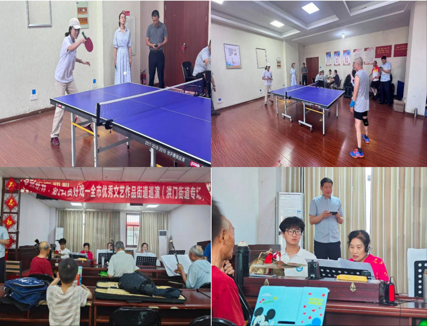 实践团深入其现代化便民服务中心,通过实地观察和工作人员的细致讲解,切身体验“一窗受理、集成服务”的高效模式,从自助终端到线上办事指南,从首问负责到帮办代办机制,数字化赋能的政务创新给师生带来惊喜。探访交流暂歇,实践队员们移步至街道文体活动中心,乒乓球台前与“老友”们展开一场跨越代际的“对决”,活动中心一角琴声悠扬,队员们和艺术团老人共同表演《喜洋洋》《南泥湾》等经典曲目,热烈掌声在曲毕时阵阵响起。