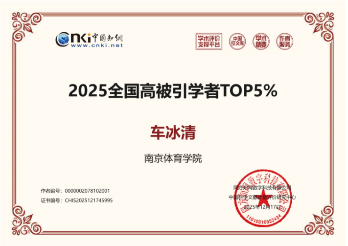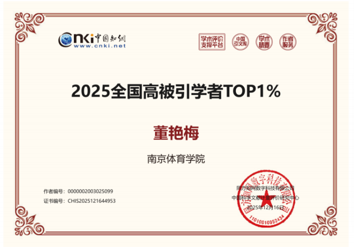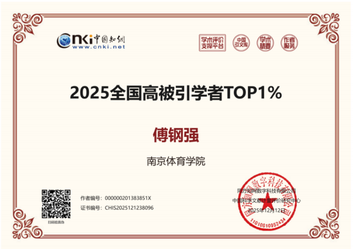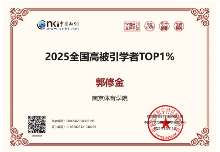 近日,作为全球最大的中文文献数据库和知识服务平台之一,中国知网(中国科学文献计量评价研究中心)发布了“2025年全国高被引学者”名单,体育产业与休闲学院有郭修金、董艳梅、叶小瑜、傅钢强4位教授进入全国高被引学者Top1%榜单;车冰清教授、张剑威博士进入全国高被引学者Top5%榜单。这充分体现了学院雄厚的科研实力和突出的学科建设成效。