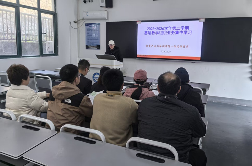为深入学习贯彻党的二十大和二十届历次全会及全国教育大会精神,推动教育强国、体育强国和健康中国建设,按照教务处统一部署,体育产业与休闲学院休闲体育系于2026年3月17日在仙林教学楼C205开展2025-2026学年第二学期基层教学组织业务集中学习。系主任朱金宁主持会议,系全体教师参会。