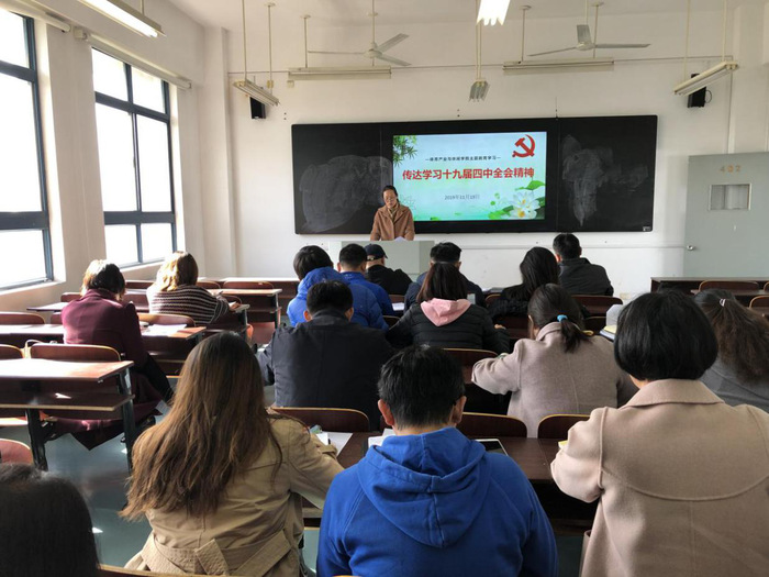 王进书记从党的十九届四中全会的基本情况、内容和成果、重大意义以及学习贯彻要求四个方面进行领学。并强调指出,学习贯彻好十九届四中全会精神是当前和今后一个时期重要任务,要以全会精神为指导,着力推进学院改革,形成学院全体师生自觉尊崇制度,坚决维护制度,严格执行制度的氛围,要把学习全会精神与做好当前工作、特别是正在开展的主题教育工作紧密结合起来,要做好学院制度的“废改立”工作。