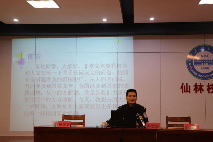 为进一步加强校园防控,增强大学生安全防范意识,12月17日,体育产业与休闲学院特邀孝陵卫派出所周志田警官作大学生安全教育专题讲座,参加讲座的有校保卫处处长、纪委委员王竹林、学院总支书记王进、总支副书记杨丽丽和辅导员沈灵知老师。讲座由学院党总支书记王进主持。