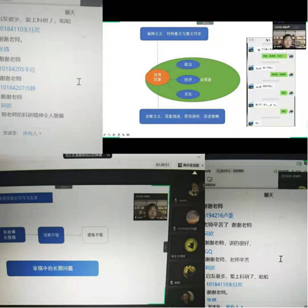郇博士从他春节回家看到的家乡广场舞、在城市空间偶然目睹的掼蛋群体等身边鲜活、生活的社会现象出发,向与会人员追溯了自己的学术史,并从中选择了部分案例阐述了,如何在体育科研中通过科学的方法,将微观观察到的现象提升到一定的理论高度的学术范式。休闲体育系的老师在讲座结束后与郇老师进行了热烈的交流切磋,腾讯会议室聊天窗口出现了各种生动的回复,本次讲座在圆满中结束。