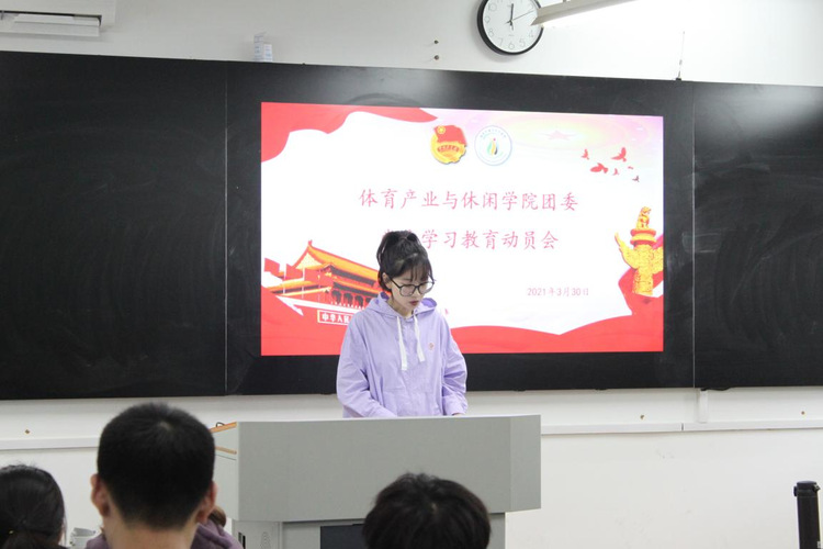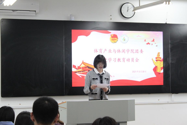 刘雪薇传达了学校党史学习教育动员大会精神及《体育产业与休闲学院关于开展党史学习教育的实施方案》,希望大家认真学习领会会议精神和实施方案要点,努力走在前列、争当标杆,引导全院团员青年从党史中汲取精神和力量,进一步夯实马克思主义和共产主义信仰根基,为广大团员青年当好榜样。