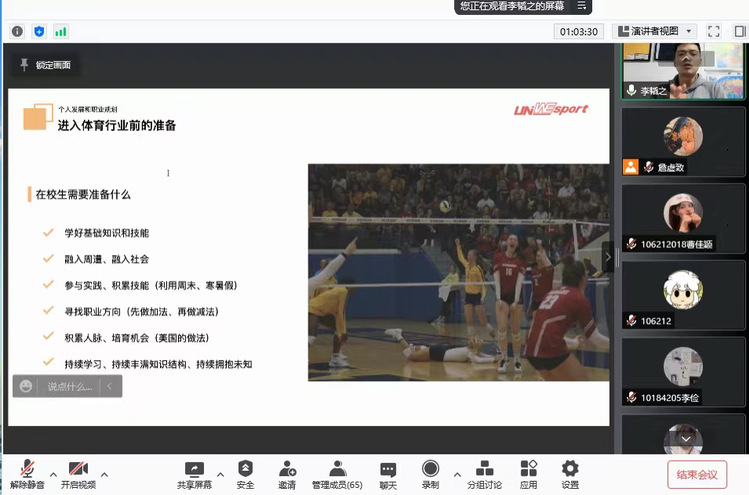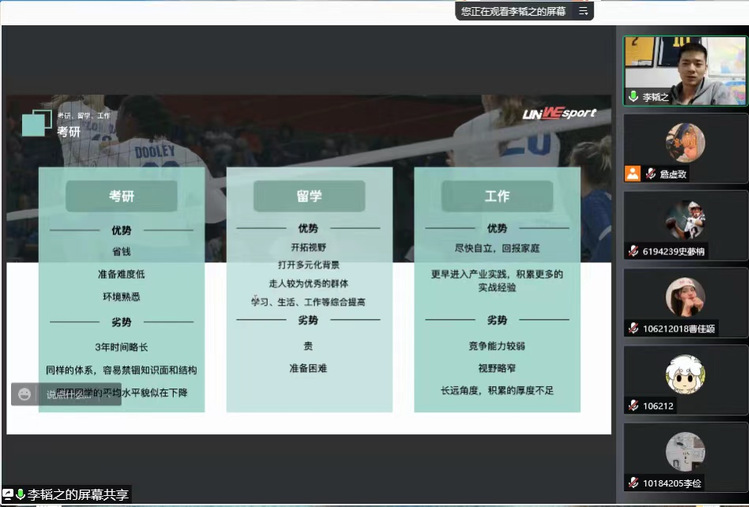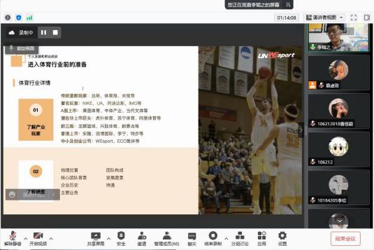 2021年11月29日晚,唯体集团创始人李韬之先生应邀为体育产业与休闲学院的研究生与本科生开展题为《体育从业者的机遇与挑战》的主题分享会,本次分享会以在线会议形式进行,体育产业学院全体研究生和部分本科生共80余人次参与本次讲座。