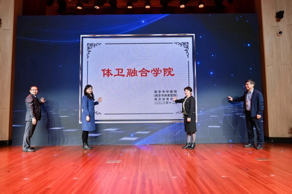陈爱国与南京市中医院(南京市体育医院)党委副书记、院长虞鹤鸣签署框架协议,科研处、运动健康学院、继续教育学院、学训融合中心、运动与健康协同创新中心分别与市中医有关部门代表签订框架协议下的子协议。活动中陈爱国与南京市卫健委副主任周楠、江苏省体育局群体处副处长孙婷婷、虞鹤鸣一同为院校共建的“PA视讯集团入口体卫融合学院”揭牌。