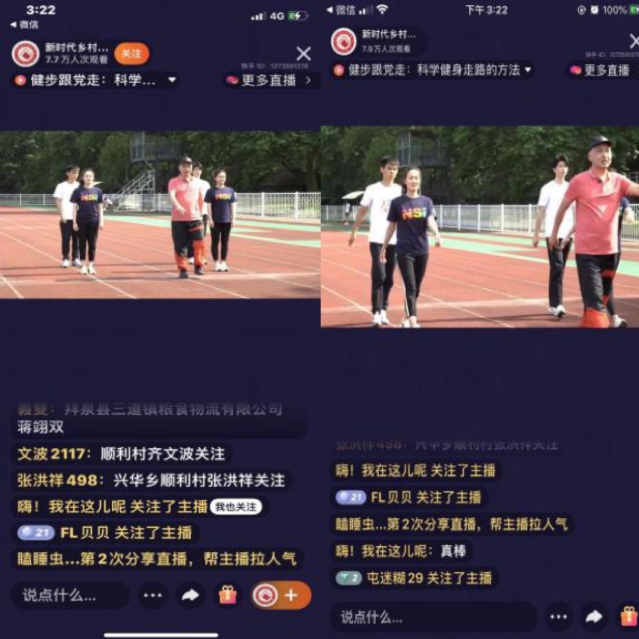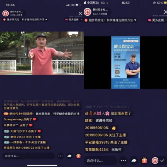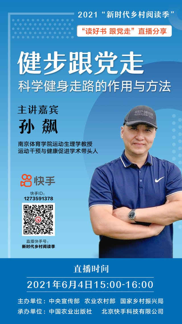 6月4日下午,由中央宣传部、农业农村部、国家乡村振兴局主办的2021“新时代乡村阅读季”,直播分享“读好书跟党走”主题活动中,运动健康学院孙飙教授所做的主题:健步跟党走——科学健身走路的作用与方法,在快手平台上进行了1个小时的直播,最终获得了55万次观看、4万多点赞的超高流量。