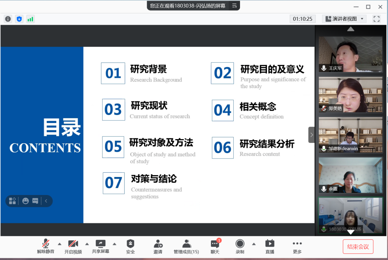 答辩中,每位参加答辩的同学着装正式、精神饱满,严格执行答辩规范要求。分别通过PPT共享屏幕和全程视频的方式对各自的学位论文进行精炼阐述。答辩组委员认真负责,从论文格式、论文选题、研究方法、研究内容等方面进行提问,对论文进行整体评价并提出修改意见。