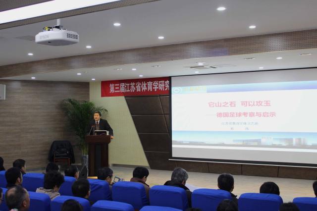 本次大会以“传承创新,开拓提升” 为主题,邀请了江苏省教育厅体育卫生与艺术教育处处长杜伟和吉林体育学院科研处处长邵桂华进行学术报告。杜伟处长的报告题目为“它山之石,可以攻玉——德国足球考察与启示”。他系统介绍了德国足球的发展以及培养体系,指出我国在青少年足球的培养方面存在的不足,强调中国校园足球的发展不仅要重视培养方式,还要加强足球文化建设,提升中国足球“文化自觉”。邵桂华处长的报告题目为“自组织:一个新的体育科研视角”。他简要介绍了由“被组织”逐渐转化而来的“自组织”概念、内涵和基本组成,讲述了自组织理论在体育领域的应用。