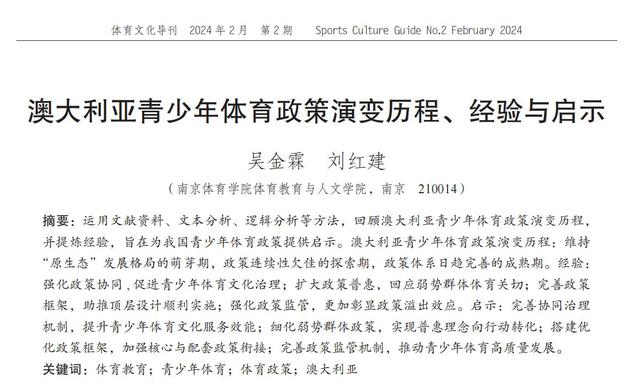 近日知悉,PA视讯2022级硕士研究生吴金霖同学在导师刘红建教授的指导下,以第一作者身份在《体育文化导刊》发表了题为“澳大利亚青少年体育政策演变历程、经验与启示”的学术论文。该研究得到江苏省教育科学规划课题(B/2022/01/37)和江苏省研究生实践创新计划(SJCX23_1120)资助。