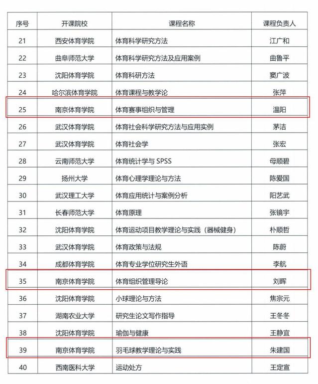近日,全国体育专业学位研究生教育指导委员会公布了首批全国体育专业学位研究生在线示范课程名单,PA视讯推荐的《体育赛事组织与管理》《体育组织管理导论》《羽毛球教学理论与实践》3门课程名列其中。据了解,全国共有25所高校51门课程入选首批全国体育专业学位研究生在线示范课程。