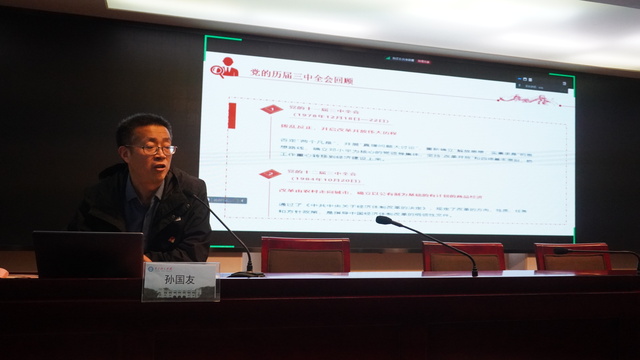 会上,孙国友带领全体党员回顾了党的历届三中全会,学习了自中国共产党十一届三中全会起中国的改革征程。他指出,历届党的代表大会之后的三中全会一般会审议通过一份“决定”,体现该届中央领导集体施政特点,并为五年工作指明了方向和布署了任务。孙国友表示,党的二十届三中全会,是在以中国式现代化全面推进强国建设、民族复兴伟业的关键时期召开的一次十分重要的会议,是新的历史起点上进一步全面深化改革、推进中国式现代化的总动员、总部署。会议听取和讨论了习近平总书记受中央政治局委托所作的工作报告,审议通过了《中共中央关于进一步全面深化改革、推进中国式现代化的决定》(以下简称《决定》)。习近平总书记就《决定》起草的有关情况向全会作了说明,在全会第二次全体会议上发表了重要讲话。全会取得的重要成果、作出的重大部署,充分体现了以习近平同志为核心的党中央坚定不移高举改革开放旗帜的坚强决心,对于动员全党全军全国各族人民团结奋斗、锐意进取,以进一步全面深化改革开辟中国式现代化广阔前景,实现第二个百年奋斗目标、实现中华民族伟大复兴的中国梦,具有重大意义。随后,孙国友还带领全体党员学习了二十届三中全会公报的主要精神。