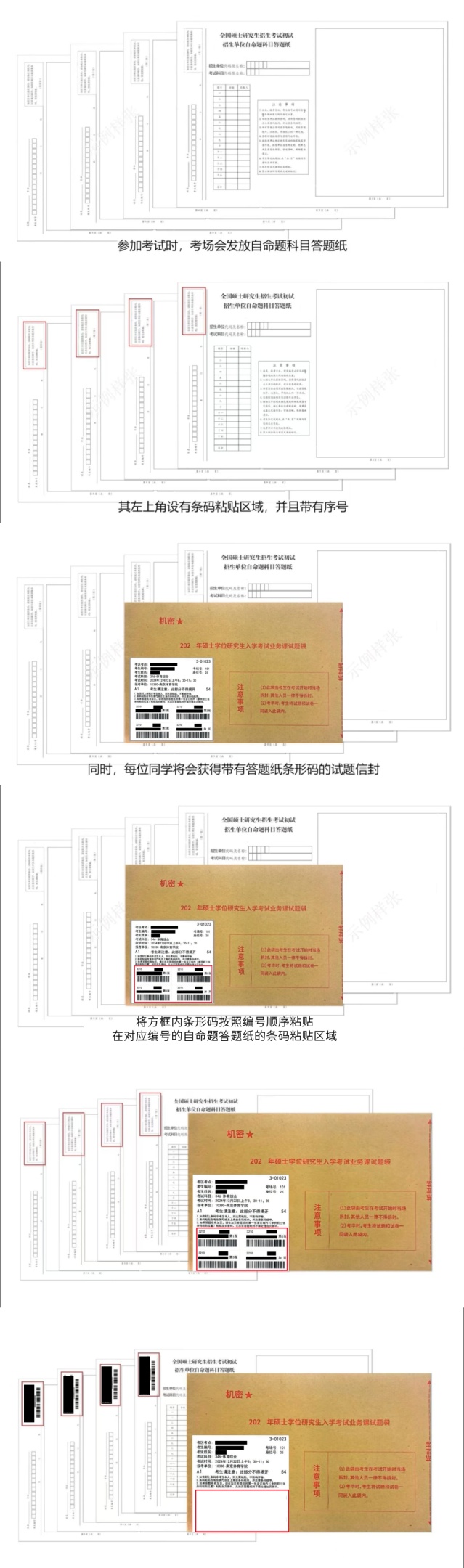 第2步:如信息一致,核对信封袋外四张答题纸条码信息(姓名,科目代码-考生编号)与信封袋上信息、本人准考证信息是否一致,并仔细阅读条码粘贴说明;