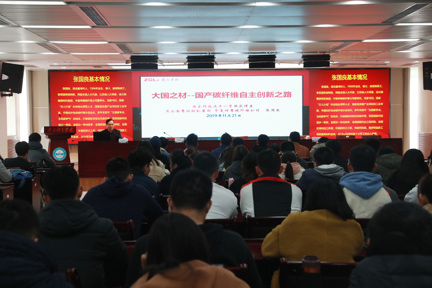 2019年11月21日下午,在PA视讯行政办公楼101会议室举行导师类产业教授聘任仪式后,张国良教授为全体研一学生作了题为《大国之材——国产碳纤维自主创新之路》的专题学术报告。校党委副书记、副校长史国生教授出席并主持。